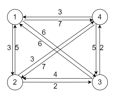 \begin{pmatrix}\infty\ \ 3\ \ 6\ \ 7\\5\ \ \infty\ \ 2\ \ 3\\6\ \ 4\ \ \infty\ \ 2\\3\ \ 7\ \ 5\ \ \infty \end{pmatrix}