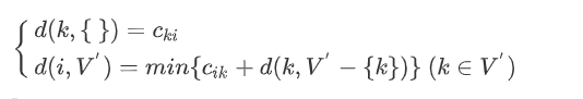 对于图G=(V, E),假设从顶点i出发,令V’=V-i,则d(i, V’)表示从顶点i出发经过V’中各个顶点一次且仅一次,最后回到出发点$i$的最短路径长度, 显然,初始子问题是d(k, {}),即从顶点i出发只经过顶点k回到顶点i。现在考虑原问题的一部分,d(k, V’-{k})表示从顶点k出发经过V’-{k}中各个顶点一次且仅一次,最后回到出发点i的最短路径长度,则:
