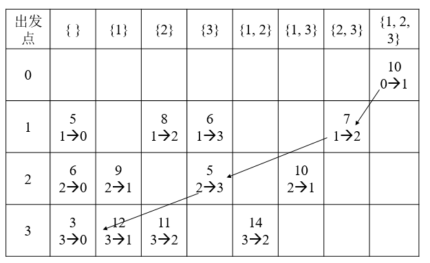 d(0, \{1, 2, 3\})=min\{c_{01}+ d(1, \{ 2, 3\}), \ c_{02}+ d(2, \{1, 3\}), c_{03}+ d(3, \{1, 2\})\}\ =min\{3+7, 6+10, 7+14\}=10(0→1)(反过来思考,这题就是求从0出发,经过中间点1、2、3)