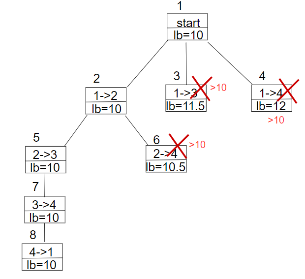 (下界:由lb的求解公式,每个节点一进一出都取最小的,相加除以二,所以[(3+3)+(2+3)+(2+2)+(2+3)]/2=10;上界:由贪心法,每次都取最近的路径到下一节点,除了已经经过的节点,初1->2(3最小),再2->3(2最小),再3->4(2最小,且只能到4),最后4->1(3)回起点,3+2+2+3=10)