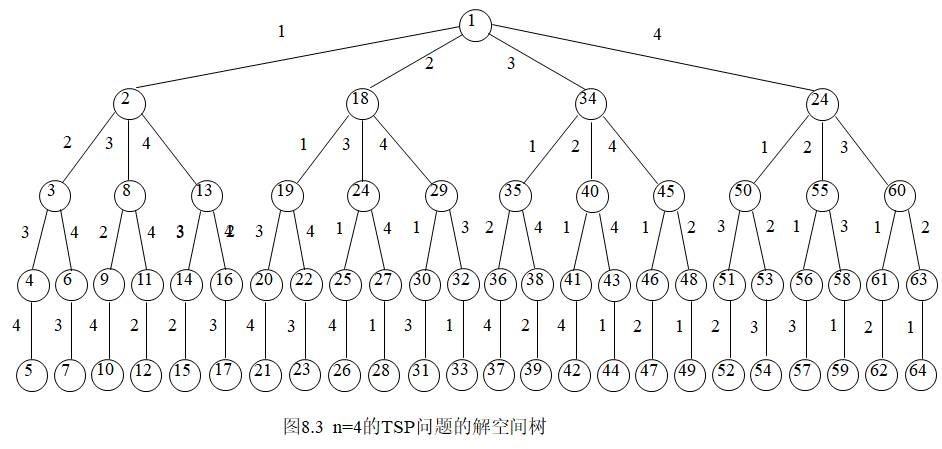 对于TSP问题,回溯法最后构造的是横向的排列树,如下,解的个数是n!